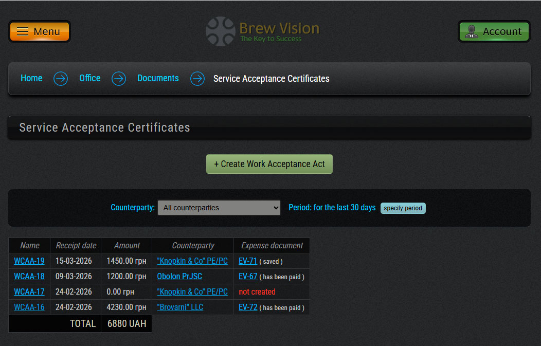 - Work acceptance certificates
