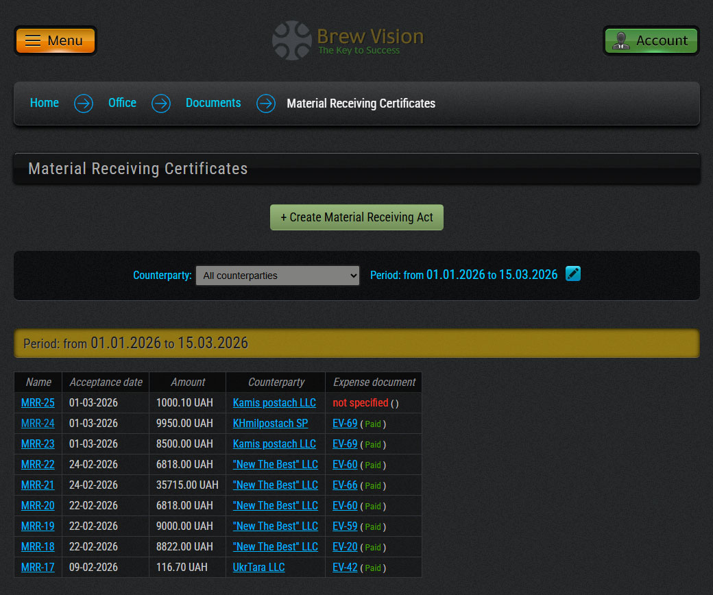 - Material acceptance certificates