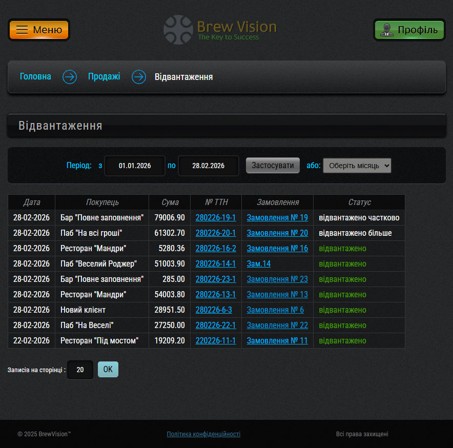 Виконані відвантаження: