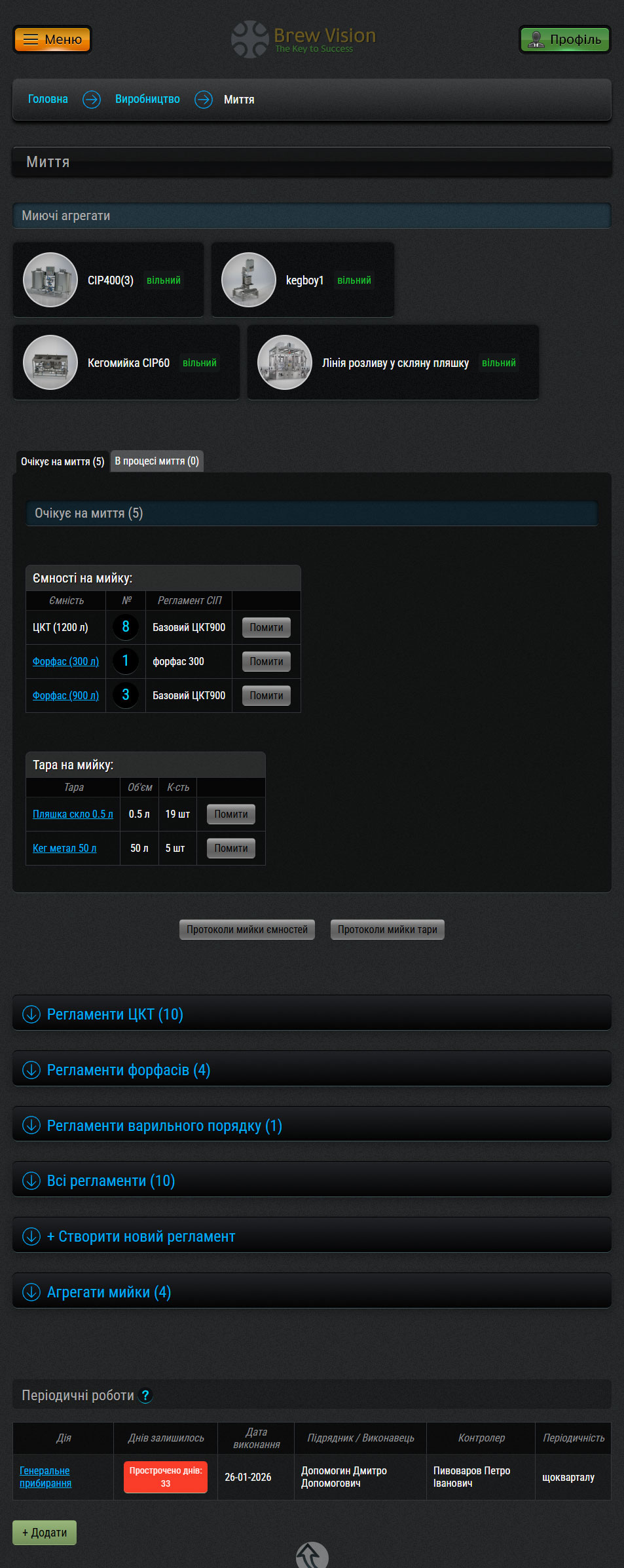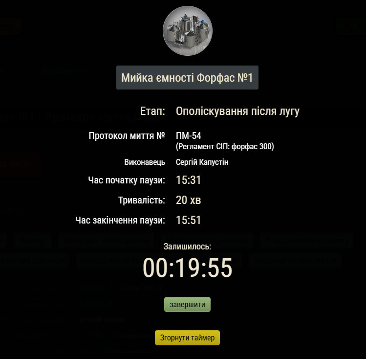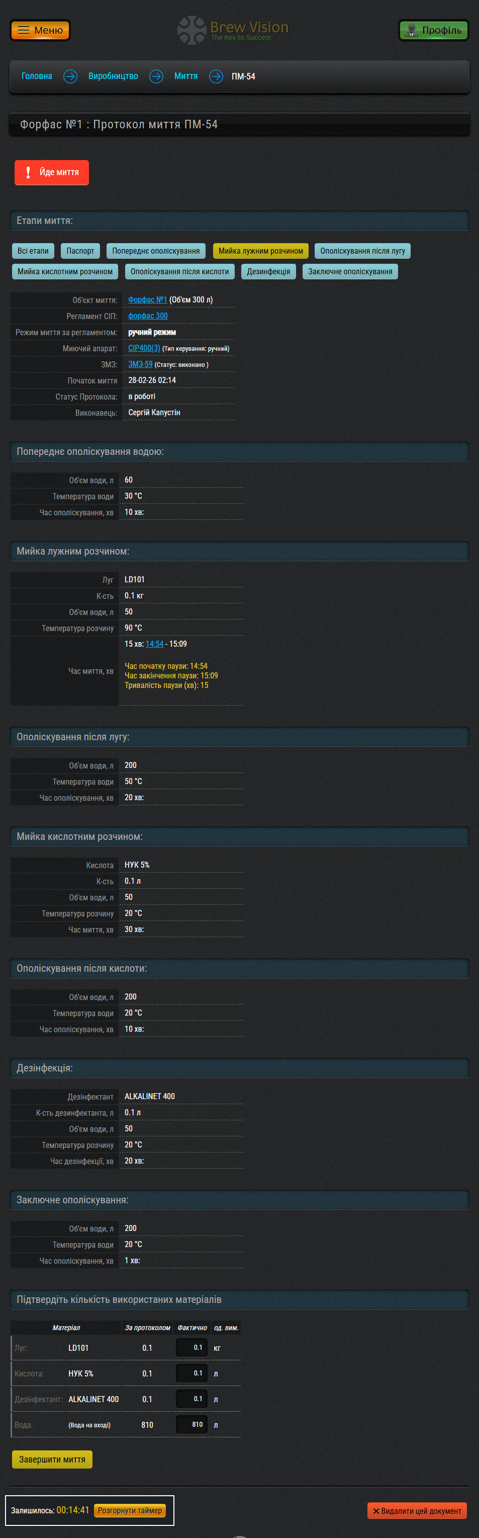 В протоколах миття треба підтвердити фактичну кількість використаних миючих засобів і система автоматично спише їх зі складу. Також для зручності і точності дотримки протоколу можна скористатися таймерами витримки часу ополіскування.