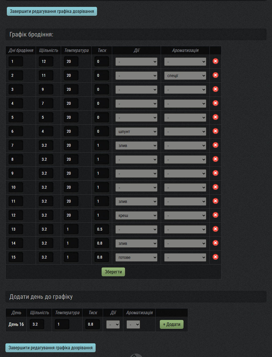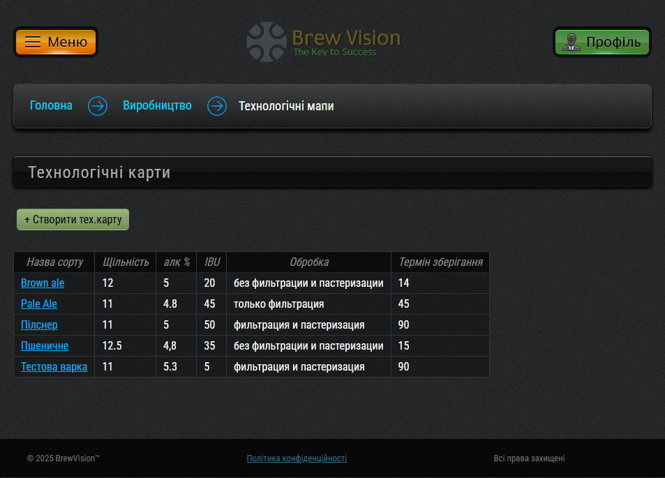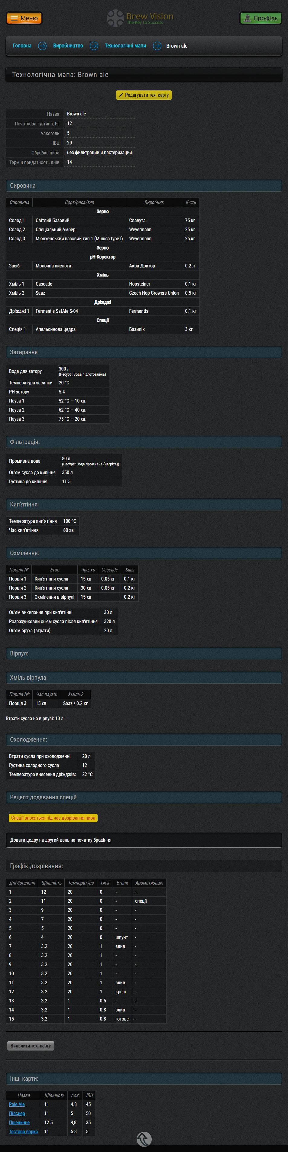 В технологічній карті можна зазначити всі параметри виробництва починаючи з кількості та сорту сировини, закінчуючи вимогами обробки при розливі (фільтраціїї/пастерізації). У разі індивідуальної інтеграції можливе додавання нових параметрів.