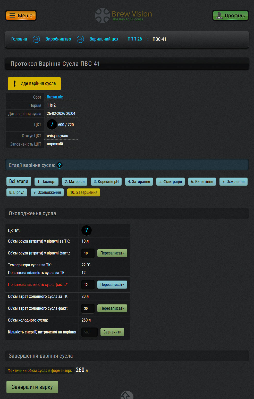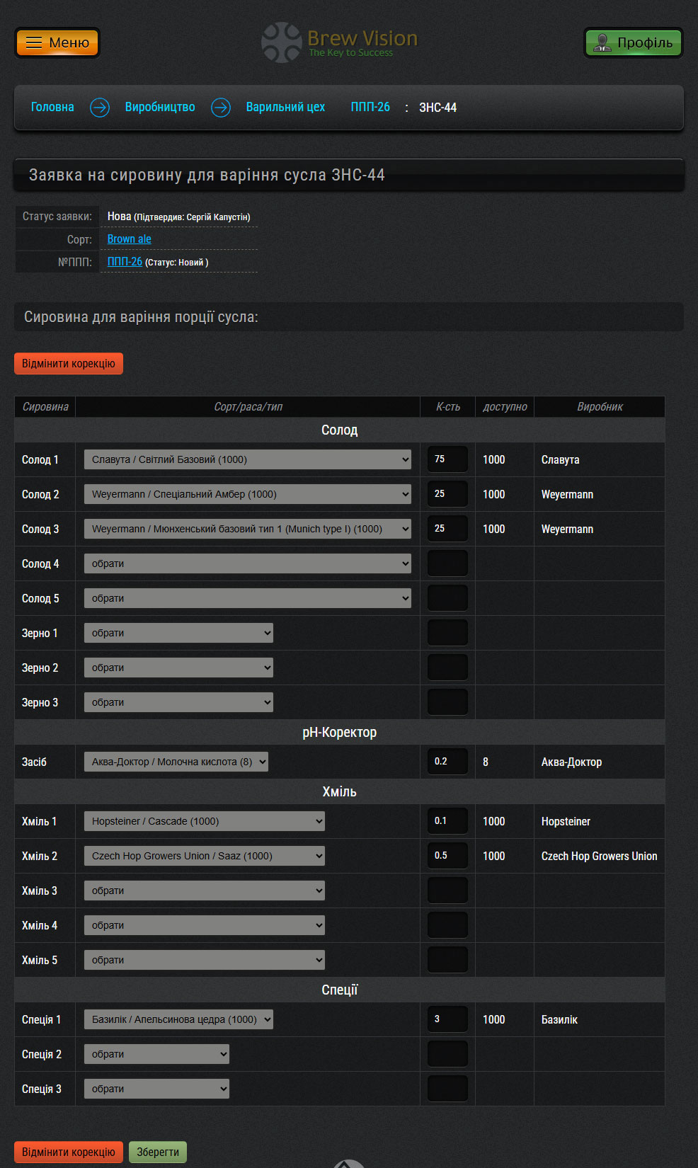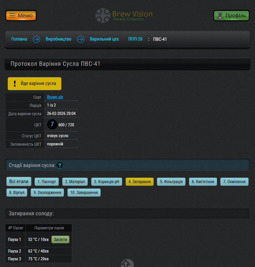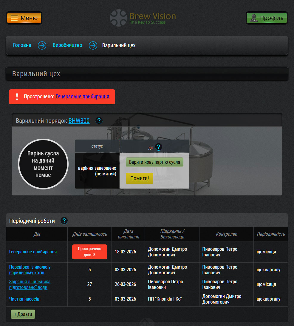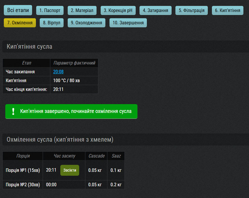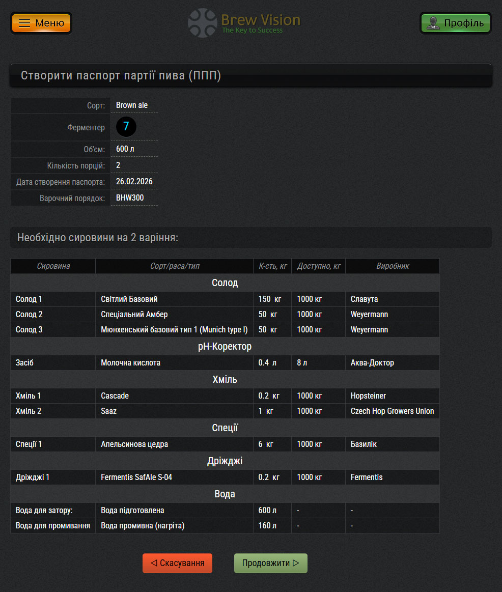 Кожна нова партія пива починається у розділі Варильний цех, де ви обираєте вільний ферментер та рецепт (технологічну карту).