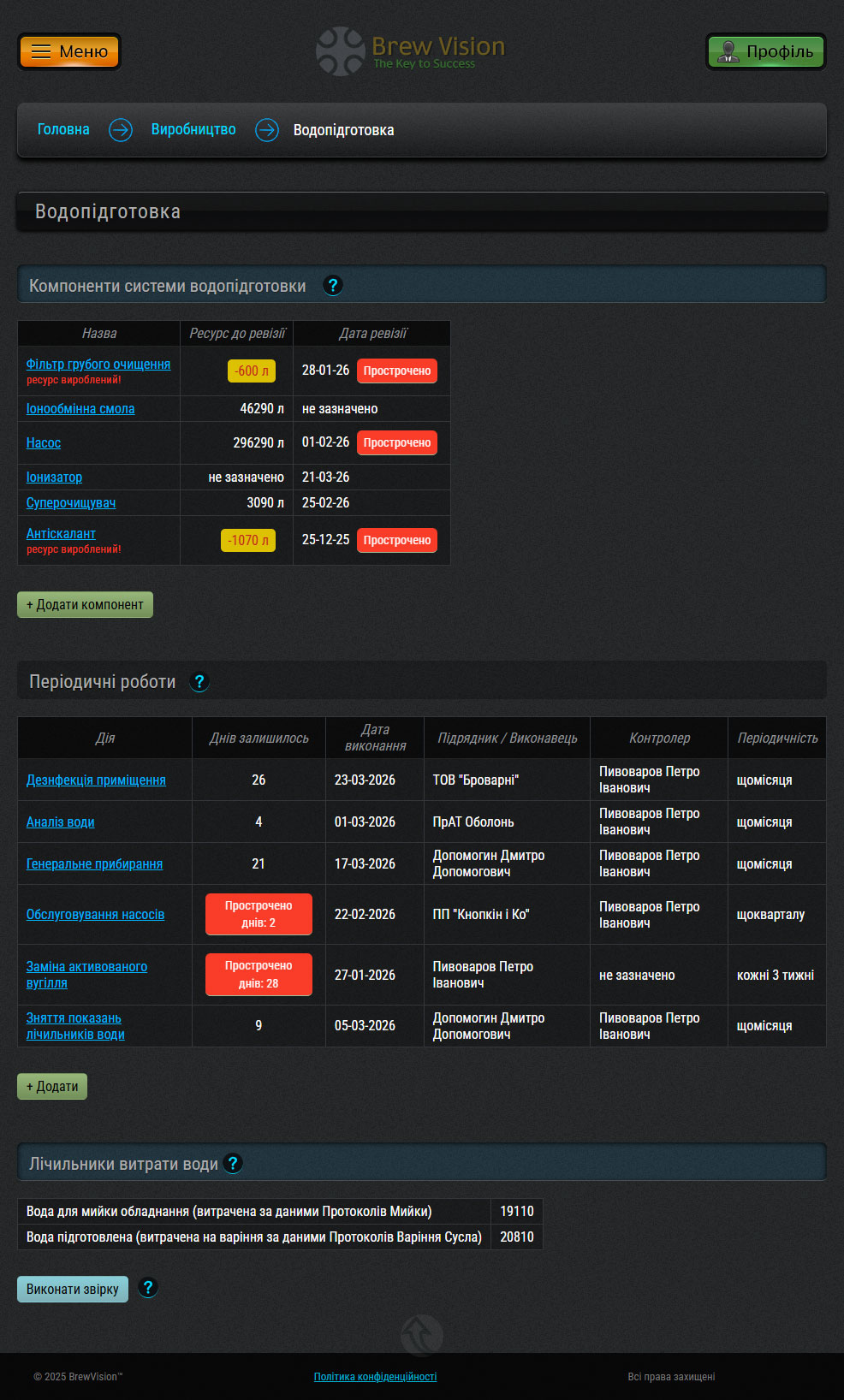 Відображені компоненти системи водопідготовки, які потребують заміни або обслуговування після вироблення певного ресурсу, що вимірюється в літрах обробленої води, та/або потребують періодичної ревізії через визначений термін.